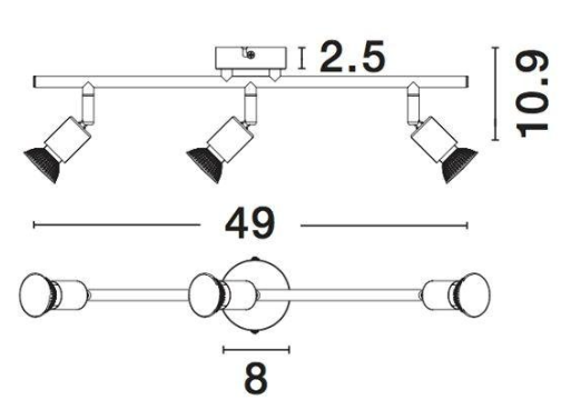 Model je osazen třemi paticemi GU10 pro světelné zdroje o maximálním příkonu 5 W na jeden zdroj. Celkový výkon svítidla tak dosahuje 15 W. Světelné zdroje nejsou součástí balení, což vám umožní zvolit LED žárovky s požadovanou intenzitou i barvou světla podle charakteru prostoru.