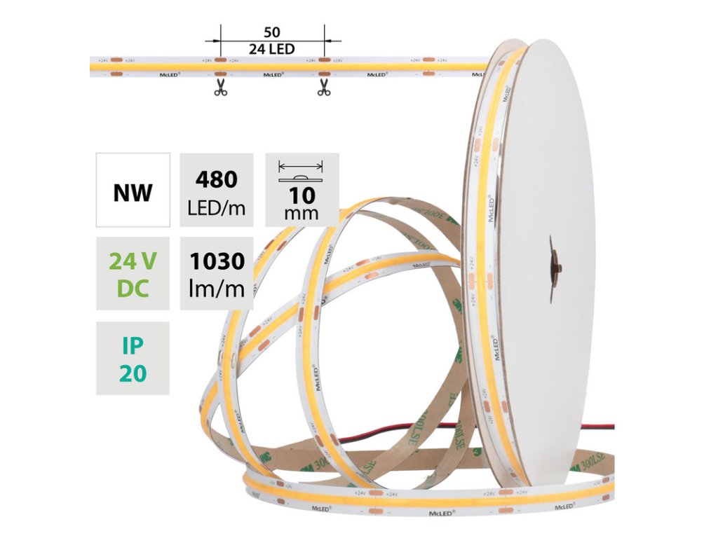 LED pásek COB NW, 480LED/m, 10W/m, DC 24V, 1030lm/m, CRI90, IP20, 10mm, 5m
