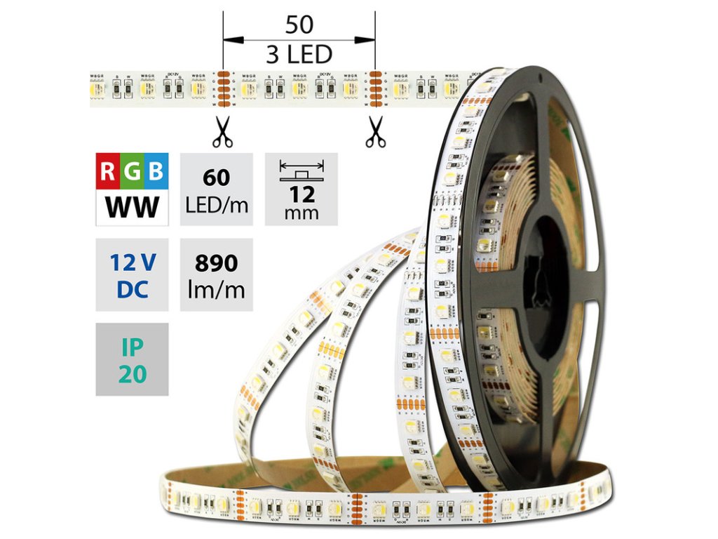 LED pásek SMD5050 RGB + WW, 60LED/m, 19,2W/m, DC 12V, 890lm/m, IP20, 12mm, 5m