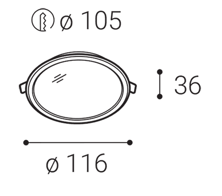 Konstrukce z kvalitních materiálů ABS a PMMA zaručuje odolnost a dlouhou životnost. Díky nízké výšce (36 mm) a montážnímu otvoru Ø 105 mm je instalace snadná a rychlá. Krytí IP20 předurčuje svítidlo pro použití v suchých interiérech.