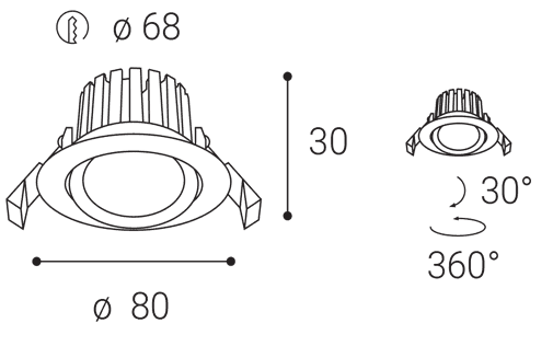 Technické parametry: průměr svítidla Ø 80 mm, výška 30 mm, montážní otvor Ø 68 mm, příkon 8 W, světelný zdroj COB LED 3000K nebo 4000K, světelný tok 735 lm, CRI > 90, vyzařovací úhel 60°. Napájení 220–240 V / 50–60 Hz, napájecí zdroj 185 mA, ovládání ON/OFF, TRIAC, DALI/PUSH nebo CASAMBI. Stupeň krytí IP65, hmotnost 0,22 kg.