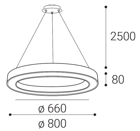 Průměr 800 mm, výška 80 mm a délku závěsu až 2500 mm. Svítidlo má příkon 60W, světelný tok 4700 lm a možnost volby teploty chromatičnosti 3000K nebo 4000K (2CCT) s vysokým indexem podání barev CRI > 90 a vyzařovacím úhlem 160°. Svítidlo lze ovládat prostřednictvím TRIAC, DALI/PUSH, DALI TW, CASAMBI TW nebo ZIGBEE TW, napájení je 220–240V/50–60Hz s napájecím zdrojem 2×750 mA. Svítidlo má krytí IP20 a hmotnost 4,9 kg.