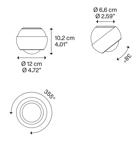 Konstrukce je vyrobena z kovu s matnou povrchovou úpravou a doplněna pochromovanými detaily. Kvalitní optika ze skla zajišťuje precizní rozptyl světla. Svítidlo nabízí široké možnosti směrování – 38° vertikálně a 355° horizontálně. Průměr svítidla je 13 cm, výška 10,2 cm.