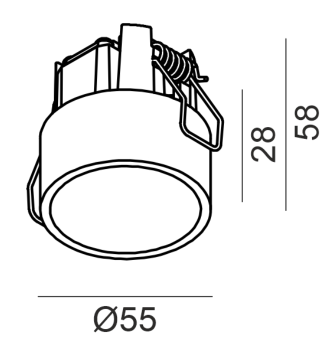 Kompaktní rozměry (Ø55 mm, výška 58 mm) umožňují diskrétní instalaci, zatímco vyzařovací úhel 55° zajišťuje příjemné směrové světlo. Svítidlo má vysoký index podání barev (CRI > 90), takže vynikne v obytných i komerčních prostorách. Díky krytí IP44 je vhodné i do koupelny nebo jiných vlhkých prostor.
