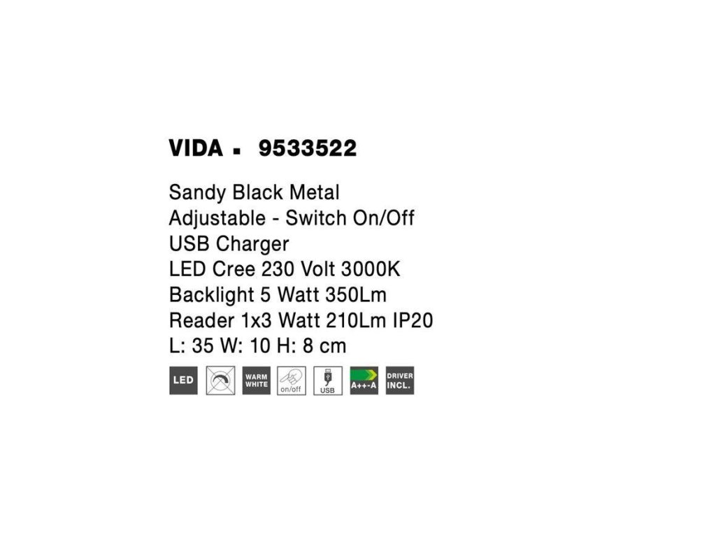Nástěnné svítidlo VIDA "pravé" černý kov nastavitelné - vypínač na těle USB nabíjení LED Cree 230V 3000K osvětlení 5W čtecí lampička 1x3W IP20 - NOVA LUCE