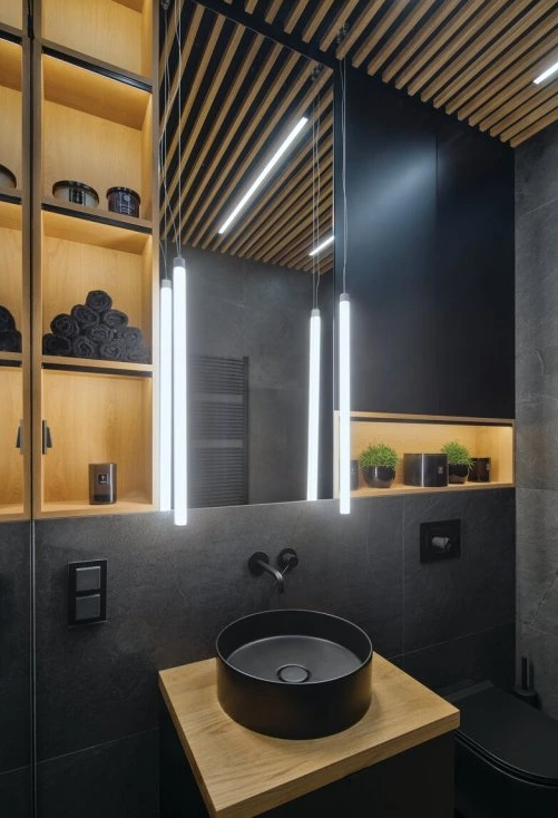 - Nepřímé osvětlení je základ – světlo se odráží od stěn a stropu, čímž vzniká jemný, rozptýlený efekt bez ostrých stínů.