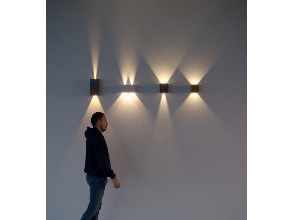 Redo Group Vary – venkovní nástěnné svítidlo s dvěma výkonnými COB LED BRIDGELUX (2 × 6W) - Vyzařování nahoru a dolů. Svítidlo nabízí světelný tok 850 lm a je dostupné ve variantách teploty chromatičnosti 2700K, 3000K nebo 4000K.