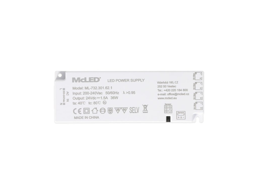 Ultra tenký, Smart LED napájecí zdroj, 36W/24 V/1,5 A s 4 mini konektory 91505-FP max. 3 A/ výstup, 200-240V AC, PF>0,95, bílý, řídící a synchronizační konektor, 144 x 50 x 18 mm