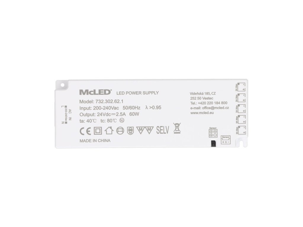 Ultra tenký, Smart LED napájecí zdroj, 60W/24 V/2,5 A s 5 mini konektory 91505-FP max. 3 A/výstup, 200-240V AC, PF>0,95, bílý, řídící a synchronizační konektor, 172 x 61 x 18 mm