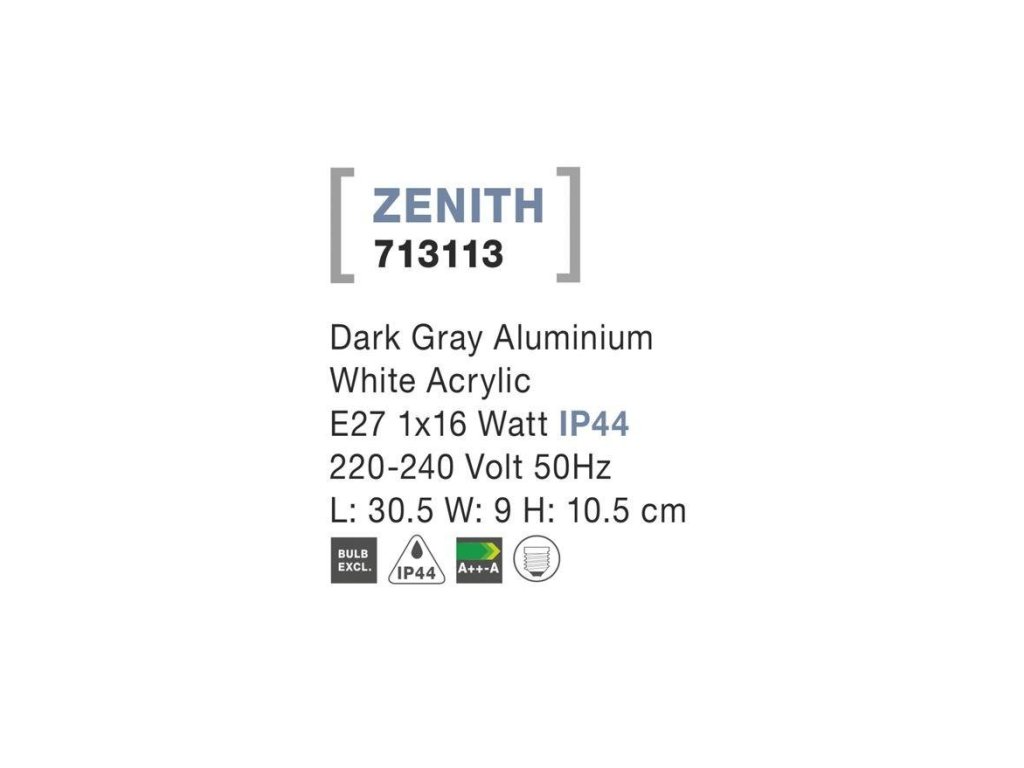Venkovní nástěnné svítidlo ZENITH tmavě šedý hliník bílý akrylový difuzor E27 1x12W 220-240V bez žárovky IP44 - NOVA LUCE