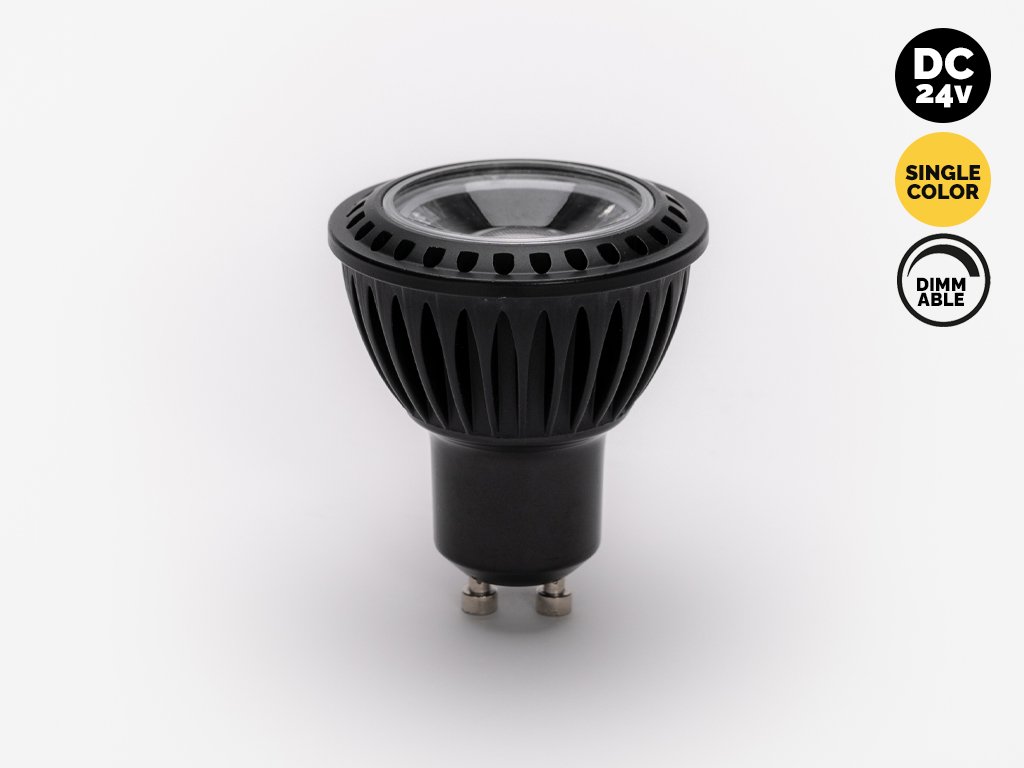 Stmívatelná LED žárovka 8W na 24V s černým tělem. S paticí GU10, COB čipem, 60º čočkou a chromatičností 1200K. Žárovka má 24V napájení, je a kompatibilní s inteligentními systémy... například Loxone, TapHome a mnoho dalších. Žárovka je pevná a má hliníkové tělo.