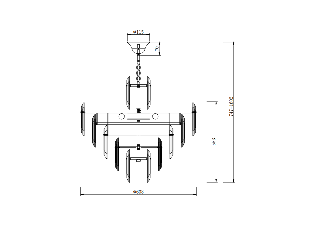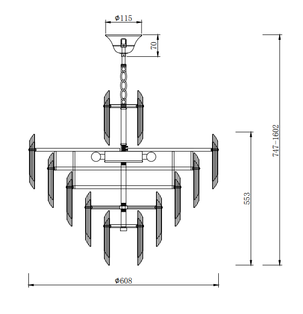 - Impozantní rozměry: Průměr 608 mm a výška 1602 mm podtrhují majestátní charakter tohoto lustru, který vynikne zejména ve větších místnostech s vyššími stropy.