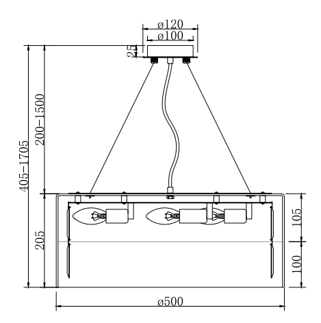 - Rozměry: Průměr 500 mm, výška 1705 mm, délka závěsu 800 mm