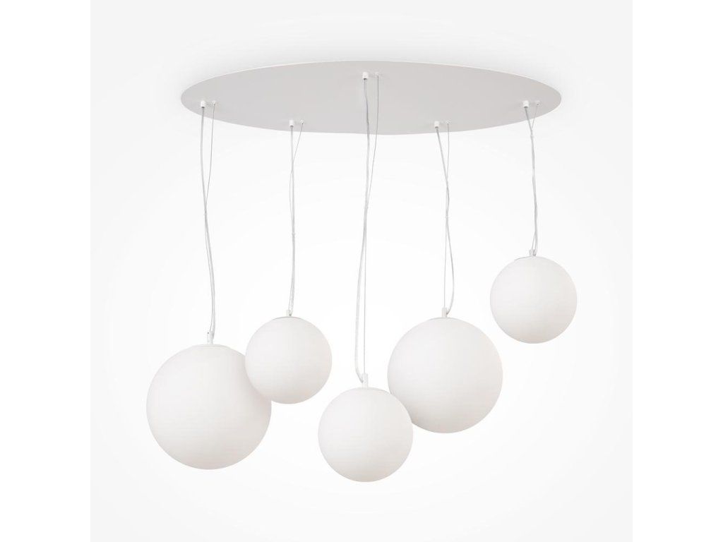 Závěsné svítidlo MAYTONI Basic form s 5 matnými koulemi přináší moderní a nadčasový design do interiéru. Elegantní bílá konstrukce působí vzdušně a skvěle se hodí nad jídelní stůl, do obývacího pokoje i prostorné haly. Ideální volba pro minimalistické a moderní interiéry.